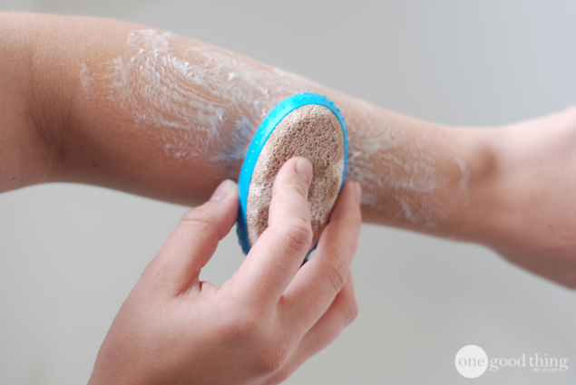 este se debe de hacer teniendo en cuenta que tanto la piel como la piedra pómez deben de estar mojadas y enjabonadas para evitar irritaciones esta debe de hacerse de una manera muy suave sin presionar demasiado la piedra los resultados se notaran en varias sesiones de esta manera se puede usar prácticamente en todo el cuerpo